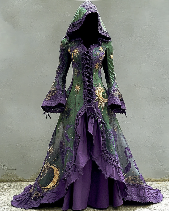 Star and Moon Theme Embroidered Gradient Lace Hooded Dress 3484