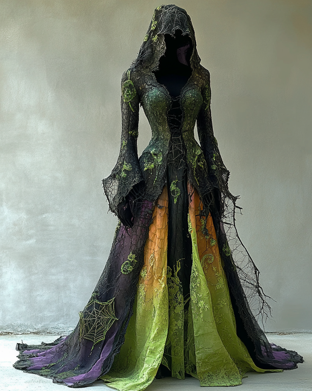 Halloween Gradient Spiderweb Embroidered Lace Hooded Dress 4c40
