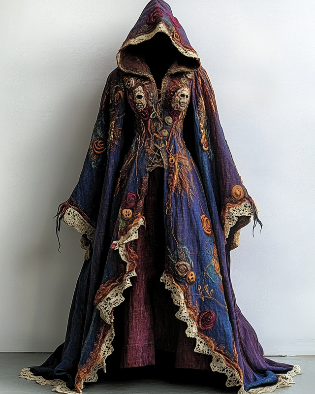 Halloween Themed Skull Rose Embroidered Gradient Lace Patchwork Hooded Cape f164