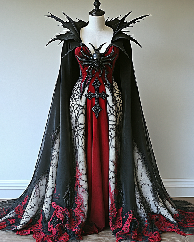 Halloween Themed Gradient Cross Spider Velvet Stand Collar Dress 7e41