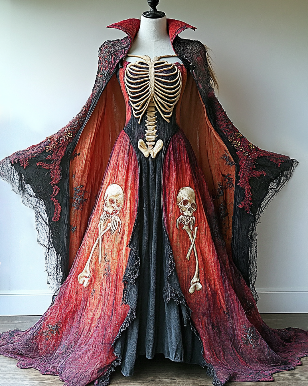 Halloween Themed Gradient Skeleton Anatomy Art Embroidered Linen Dress ce7c