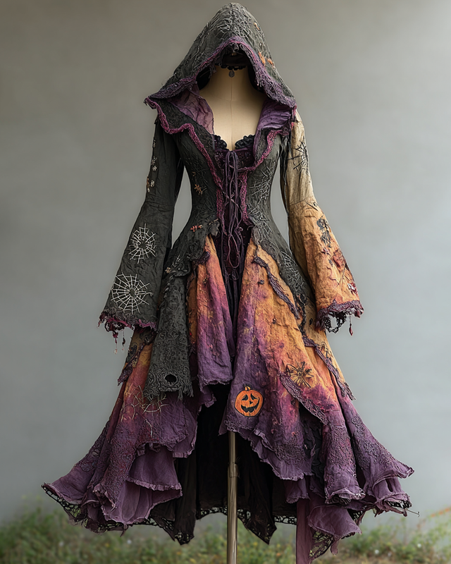 Halloween Themed Irregular Gradient Embroidered Hooded Dress 007a