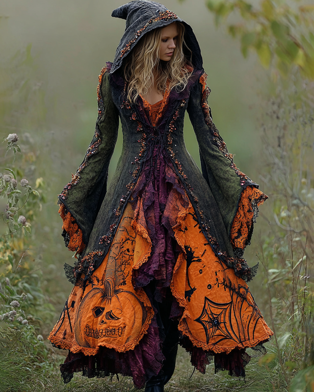 Halloween Themed Irregular Pumpkin Spiderweb Embroidery Hooded Dress 2bc3