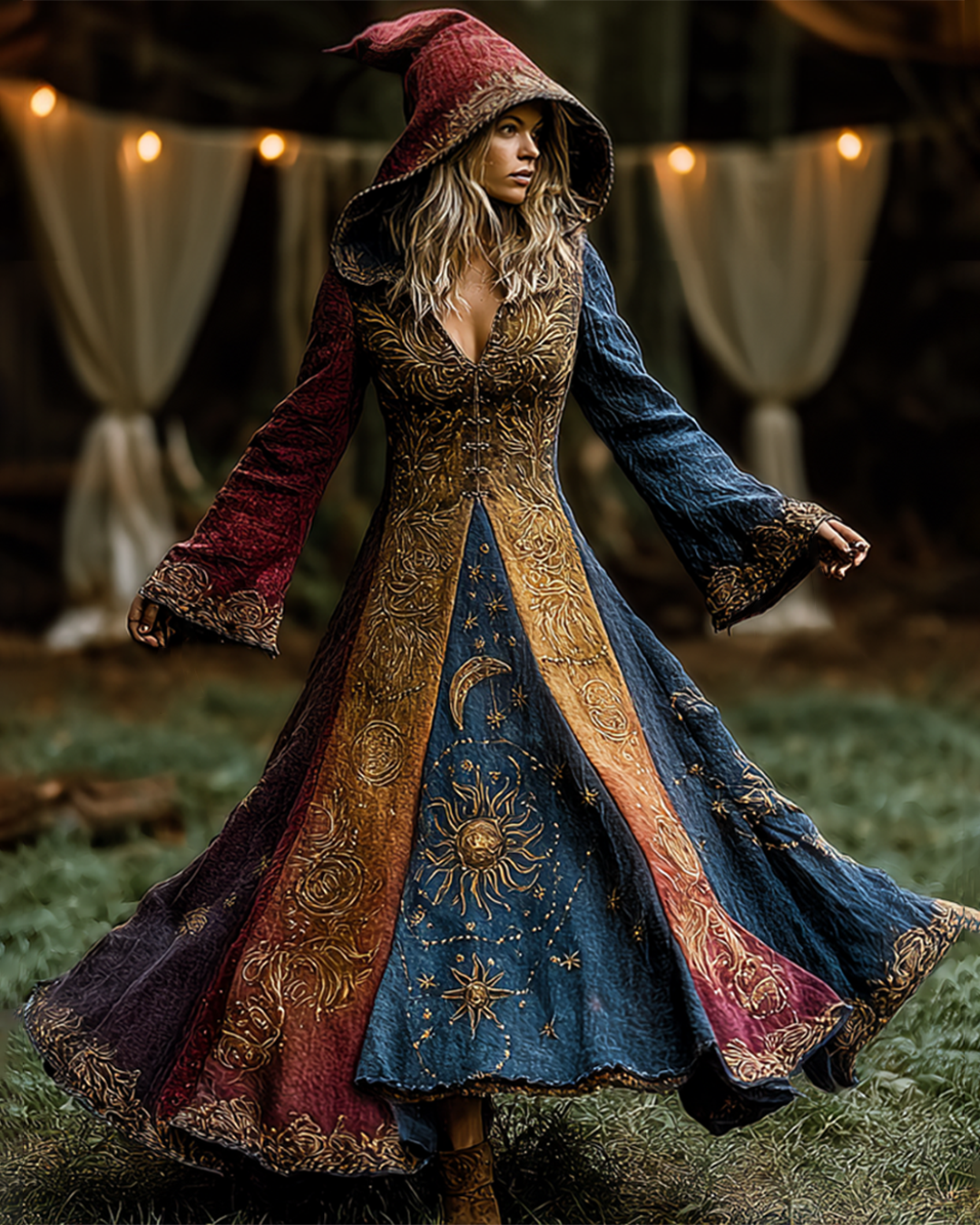 Star and Moon Theme Contrast Embroidery Patchwork Ruffle Hooded Dress 2cee