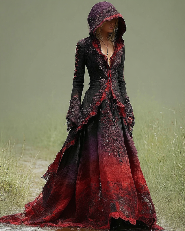 Halloween Themed Irregular Gradient Lace Patchwork Hooded Dress dc91