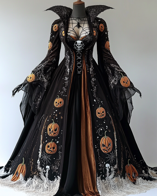 Halloween-Themed Pumpkin Embroidered Lace Velvet Witch Dress 2854