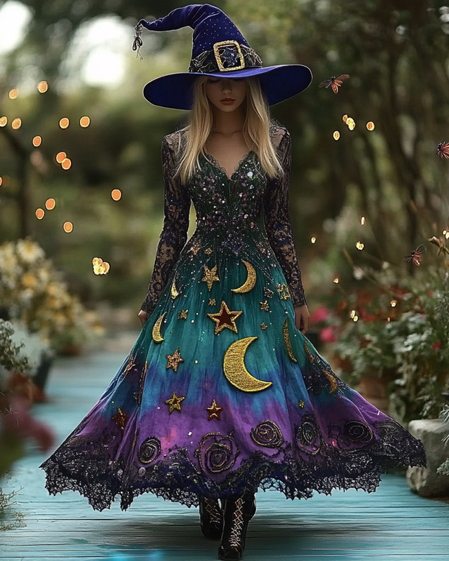 Halloween Themed Tie-dye Star And Moon Embroidered Gradient Witch Dress 7614