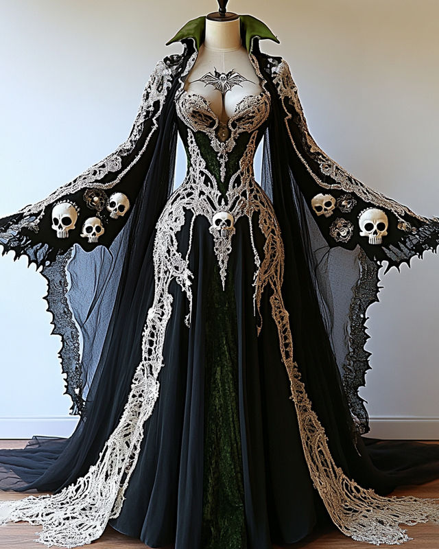 Halloween-Themed Skull and Spiderweb Embroidered Lace Velvet Witch Dress a5bf