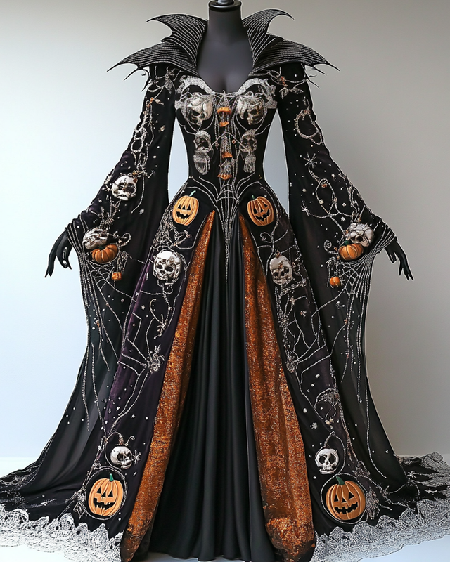 Halloween-Themed Contrast-Color Pumpkin Spiderweb Embroidered Lace Velvet Witch Dress b59b