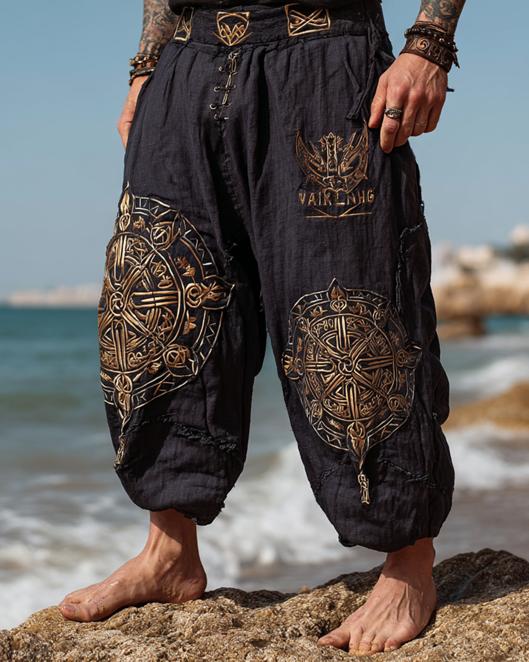Men's casual Viking mysterious shield 3D embroidered linen pants d680