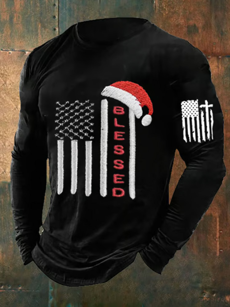 Men's Christmas American Flag Blessing Faith Print Long Sleeve Top