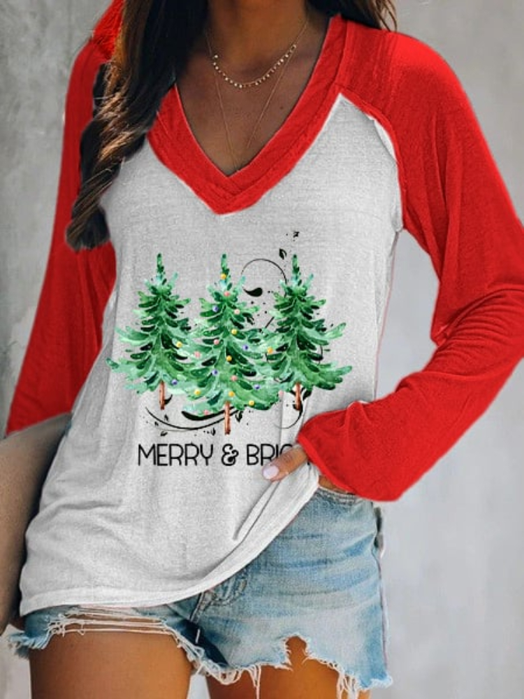 Merry And Bright Printed Colorblock V Neck T Shirt