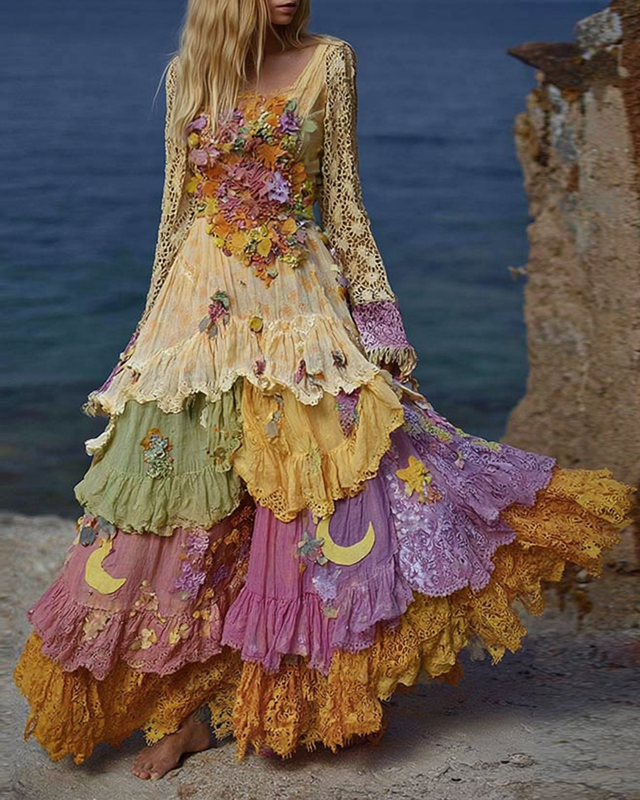 Seaside Irregular Floral Star And Moon Embroidered Lace Patchwork Linen Dress 2bac